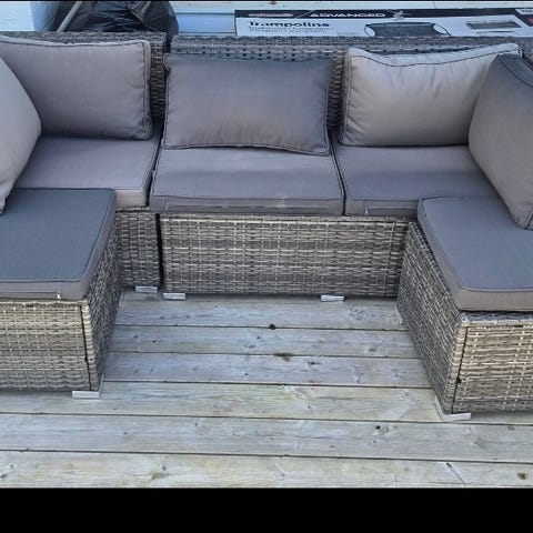 Hörngrupp i grå konstrotting med blelta dynor, flera moduler som kan ställas om. Litet matchande bord ingår i samma stil som soffan.