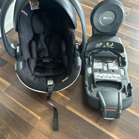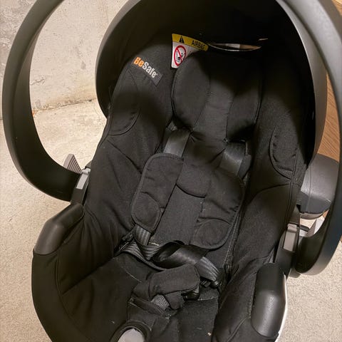 BeSafe babyskydd för barn 0–13 kg i svart tyg. Har bärhandtag, solskärm och intern sele med spänne. Babyinlägg som tas bort i samband med att bebisen växer.