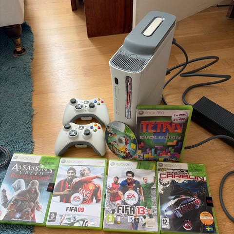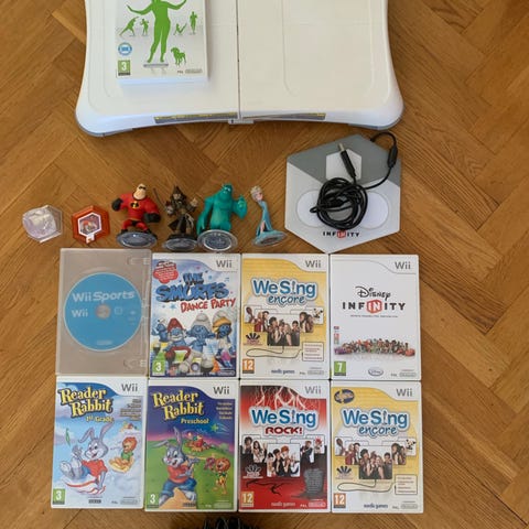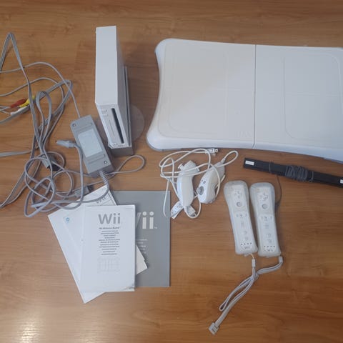 Nintendo Wii med vit konsol och Wii Fit-bräda samt dansmatta. Följer med flera spel i olika genrer samt handkontroll med nunchuk och sensorrad.