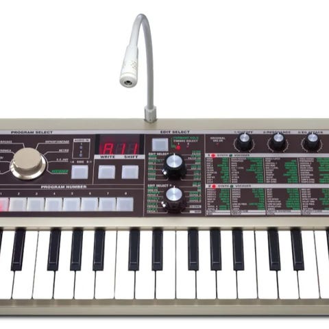 Korg microKORG synt med klaviatur och många reglar och rattar för ljudformning. Med inbyggd vocoder och mikrofoningång samt tydlig panel med programval och display.