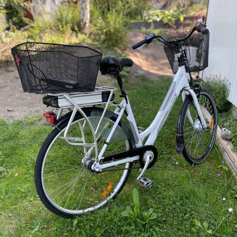 Helt ok cykel fast handbromsen behöver fixas och kedja. Smörjas. Bra däck och skön att cykla på. Vet ej storlek, men jag är drygt 170 och den passar mig bra. Har tappat bort nyckeln till låset, så det följer med bärbart lås och nyckel.