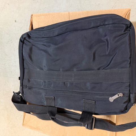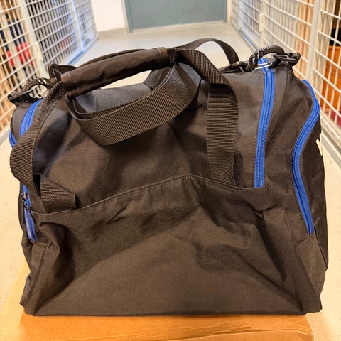 Stor svart/blå tygsportväska från & Other Stories/Kempa på 60 liter med korta handtag och axelrem. Flera fack med dragkedja och tryckt text/nummer på sidorna.