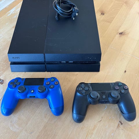 Sony Playstation 4 spelkonsol i svart med två handkontroller, en blå och en svart. Strömkabel syns också på bilden.