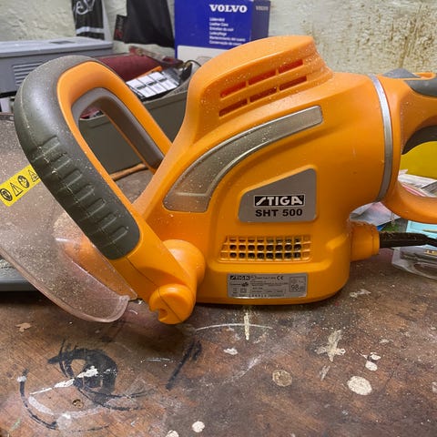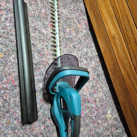 Makita häcksax i blått med långt svärd och skyddsskena. Har framhandtag med bygel och genomskinligt skydd framför knivarna.