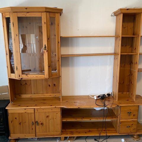 Äldre furu möbel; vitrinskåp vägghängd med rejäl skänk, lådor & stora låsbara skåp