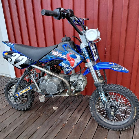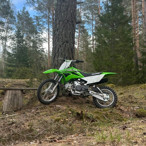 Blå 125cc fullt fungerande cross / dirtbike med grova däck och hög markfrigång. Har sadel i svart, fram- och bakskärm samt fotpinnar och stöd.