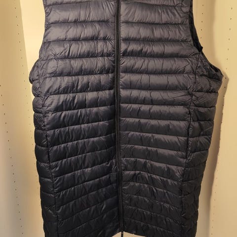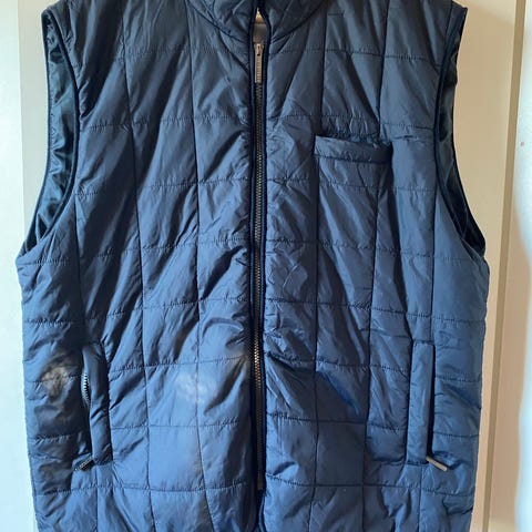 En brun väst med huva. Västen har en dragkedja framtill och två band i huvan. Västen har en ficka på bröstet.