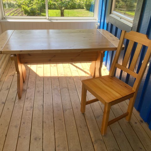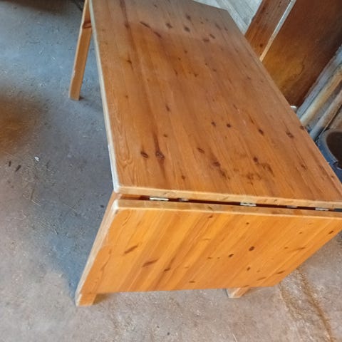 Litet köksbord i furu med med svarvade ben och uppfällbar tilläggsskiva skiva