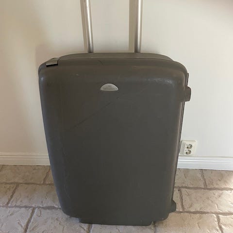 Brun Samsonite resväska i fuskläder med kombinationslås upptill. Invändigt finns remmar som håller kläderna på plats och en ficka med resår i locket.