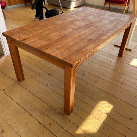 Stabilt matbord i trä, ca 140 cm långt.