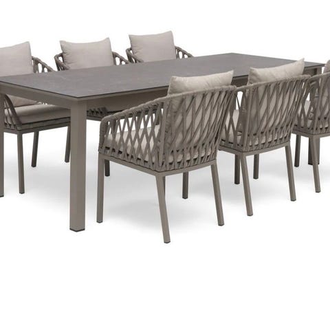 Grått matbord med sex stolar för uteplats eller altan. Bordet har rak, slät skiva och stolarna har höga ryggar och armstöd i vitt stativ med grå sits och rygg.