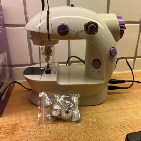 Vit och blå symaskin med flera inställningsreglage på sidan. Elsladden lindas runt maskinen och det finns handtag upptill för enkel flytt.