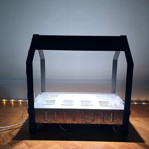 Hydroponiskt odlingssystem i grå plast med flera insatser och hål för plantor. Medföljer odlingskrukor, lock, lecakulor samt instruktionsbok för nybörjaren 😊