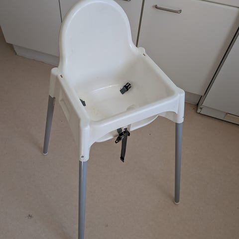 Vit barnmatstol från IKEA, modellen ANTILOP med grå ben.