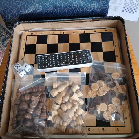Collection Classique 5 in 1 träsällskapsspel med schack, dam, backgammon m.m. Förvaras i en plåtlåda med spelpjäser i trä och bräde inuti.