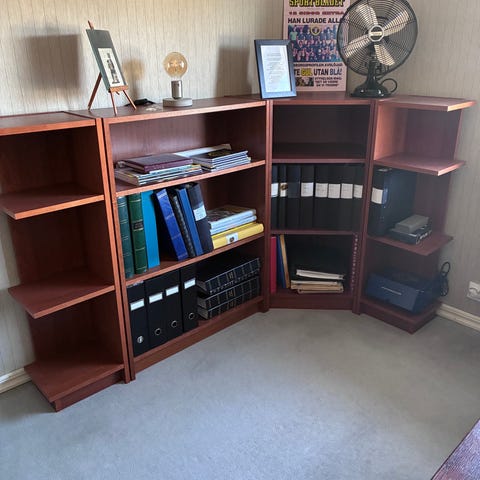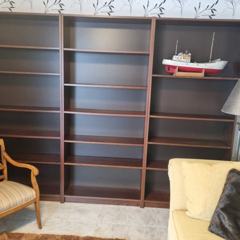 Ingår även 2 stycken hörnhyllor som är 32 cm breda, 28 cm djupa och 200 cm höga.