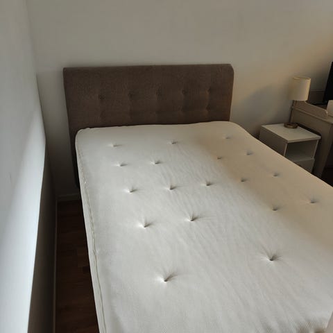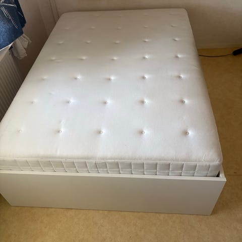 Resorbottensäng 120 cm mediumfast från Jysk med bäddmadrass Tustna från IKEA. Alltid använd med madrasskydd. Bäddmadrassen har några fläckar trots det. Beige extratyg till resorbottnen ingår. Slitet madrasskydd kan även det ingå om så önskas. Ben saknas.