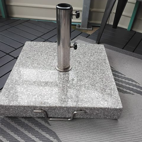 Stadig parasollfot i granit med rör i metall. Har handtag och skruvar på röret så du kan spänna fast parasollet.