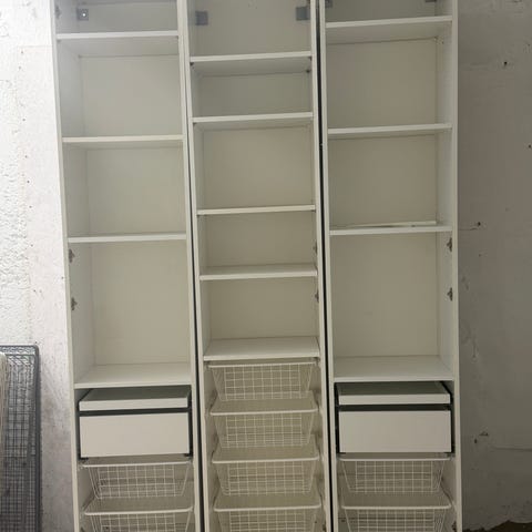 Flera lådor och hyllplan. Av de stora lådorna finns två till så totalt sex stycken. Två olika hängsystem för galgar.