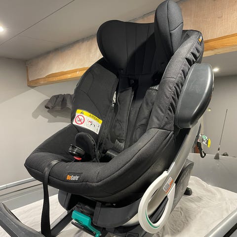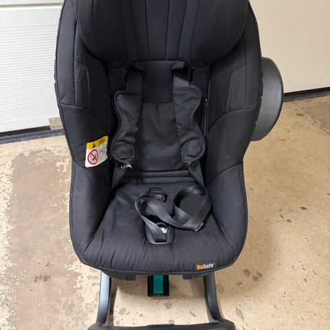 BeSafe bilbarnstol för upp till 18 kg, bakåtvänd modell i svart med grå detaljer. Har stödben, bygel och tydliga bältes- och isofixmarkeringar på sidorna.