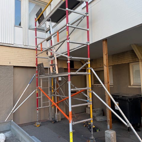 Jag har haft den uppställd i lite olika former, se bilder. Går givetvis att bygga som man vill. Det är ett stort paket som räcker till mycket ställning, mycket mer grejer än ett vanligt villapaket med gaveltopp. Det mesta är i aluminium och väldigt enkelt att bygga ihop själv. Ställningen är i gott skick.