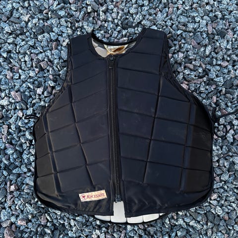 Svart säkerhetsväst från Racesafe, modell RS i stl child XL. Dragkedja fram, snörning i sidorna och flexibla paneler både fram och bak.