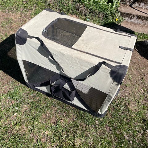 Svart bilbur för hund med nätväggar och plan ovansida. Medföljer en mjuk, ljus dyna i botten för extra komfort.