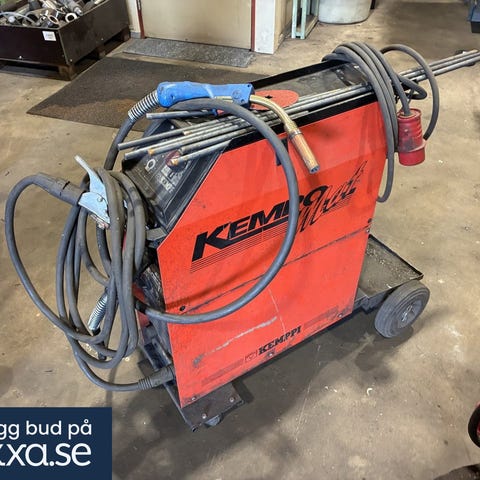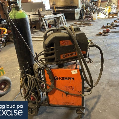 Professionell TIG-svets från Kemppi i kraftigt utförande, monterad på vagn och utrustad med separat kylaggregat. Levereras med slangpaket och kablage – redo för verkstad eller industriell användning.