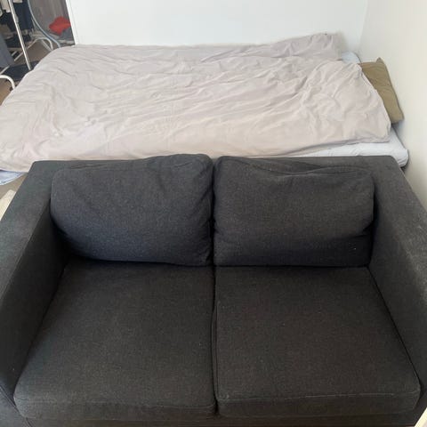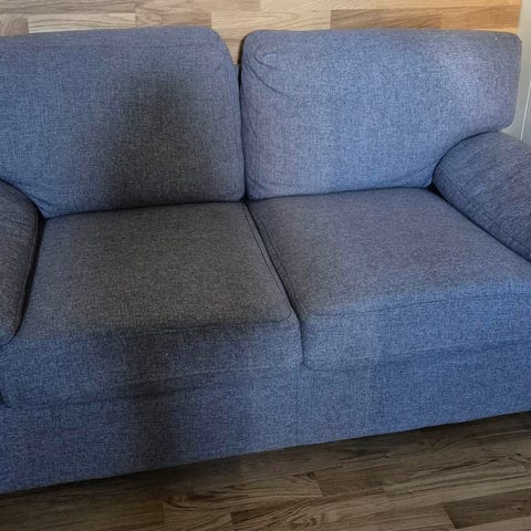 Bekväm liten tvåsits soffa med hög rygg. Rygghöjd 65, sittdjup 50 och sitthöjd 44. Fasta dynor. Stoppade armstöd. Nytvättad. Hämtas på Hägerstensåsen. Först på plats.