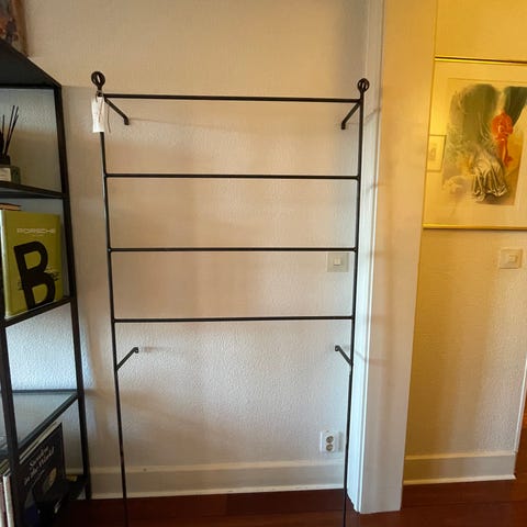Det metallstället i smide har flera ribbor, passar bra för exempelvis plädar. Fästs mot väggen upptill såväl nertill och har ben som står mot golvet.