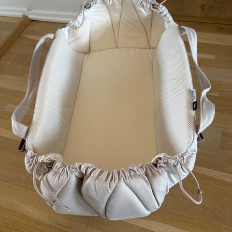 Najell babynest i vit/beige färg med bärhandtag på sidorna. Mjuk kant runt om och madrass i botten, dras åt med snören i ändarna.