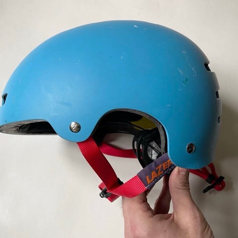Lazer One+ MIPS cykelhjälm i storlek S (52-56cm). Hjälmen är blå med röda remmar och har MIPS-teknologi för ökad säkerhet. Den har ventilationshål för god luftcirkulation och ett justerbart system för passform. Tillverkad 07/17.