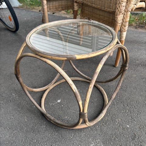 Runt bord i brun rotting med flätad sits. Har en extra hylla undertill med ribbor som ger bra avställningsyta.