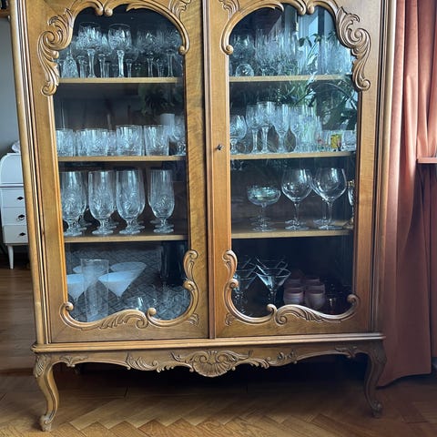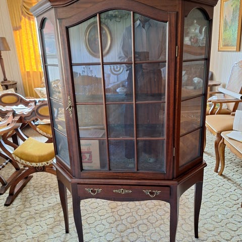 Väldigt fint vitrinskåp med färgat glas och belysning. Knappen till strömbrytaren för skåpet är dessvärre trasig, belysningen fungerar, men själva strömbrytaren gick sönder i själva knappen men väldigt enkelt att byta ut.