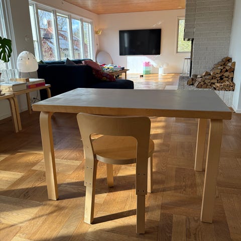 Stol från Artek designad av Alvar Aalto med vit rund sits och ljusa ben. Enkel att passa in vid skrivbord eller matbord hemma.
