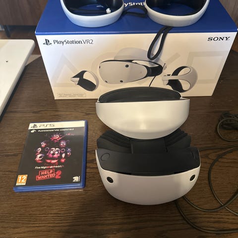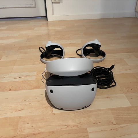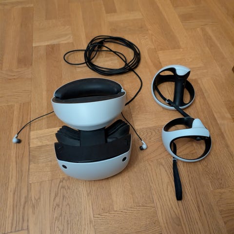 Sony PlayStation VR2 till PS5 med vitt headset och matchande handkontroller. USB‑C kabel för anslutning och justerbart band runt huvudet.