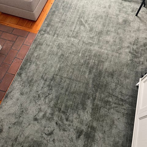 Viskosmatta Pyramid från Mio i storlek 200x300 cm, mörk brun/grå med diskret rutmönster. Finns en kaffefläck på mattan.