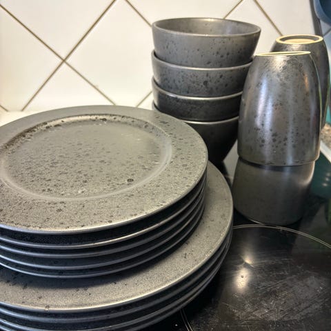 Svarta/grå sopptallrikar och skålar från Aida i stengods med spräckligt mönster. Flera olika storlekar, bra som både sopptallrikar och serveringsskålar.