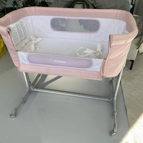 Moweo bedside crib i vitt tyg med mesh-sidor som gör att man ser barnet bra. Står på träram med hjul så den är lätt att rulla intill sängen.