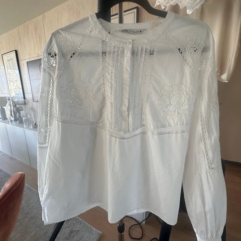 Vit blus från H&M Edition i stl 36, i bomull med volanger och broderade detaljer fram. Långärmad modell med v-ringning och knäppning bak i nacken.