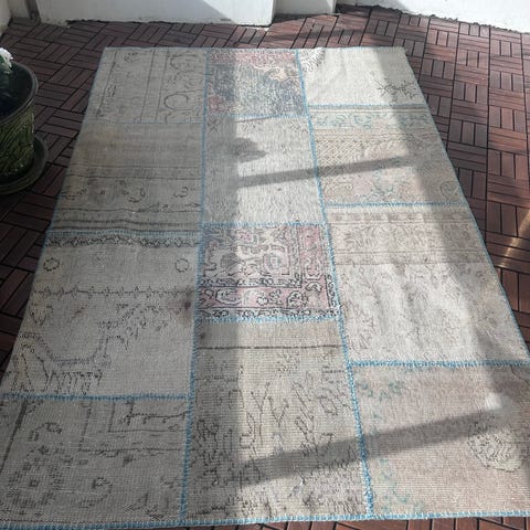 Flerfärgad matta i patchworkstil med olika rutor och ränder. Tunn och lätt matta som passar bra under soffbord eller i vardagsrum.