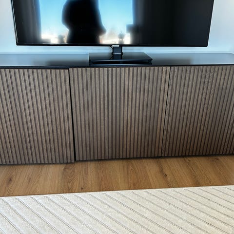 En äldre modell av skåpet Bestå säljes. Färgen är svartbrun. 77 cm högt utan ben (87 cm högt med ben), 120 cm brett och 41 cm djupt. Nypris för denna skåpkombination är 2800 kr.