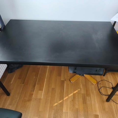 Svart skrivbord från IKEA. Fyra ben som fästes med stora skruvar i skivan. Använd skick men väl fungerande och stabilt.