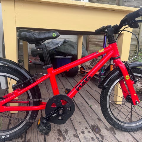 Cykeln är i väldigt fint skick och har varit så bra för oss och vårat barn. Hon klev upp på cykeln när hon var 4 och det tog inte lång tid innan hon klarade av handbromsarna och cyklingen. Att cykeln är så lätt jämfört mot många andra cyklar på marknaden har gjort att det har gått att cykla även när det blir lite uppförslut. Så himla bra cykel.