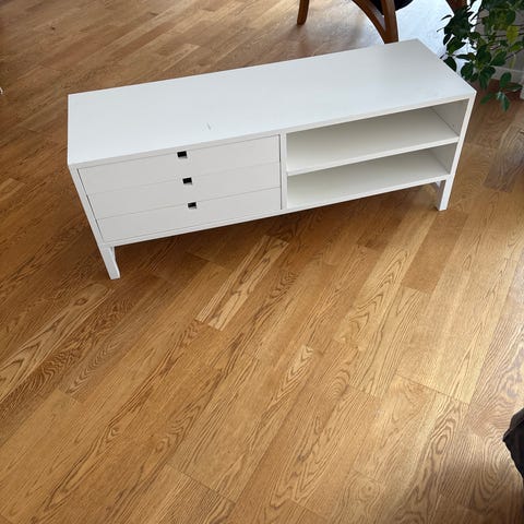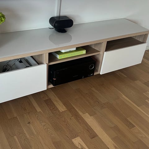 TV-Bänk med skjutluckor säljes. Suttit monterad vägghängd på korta elfa konsoler som följer med. Eller välj att köpa till möbelben och ha den på golvet. Hål gjorda i bakkant så det går att dra kablar mm mellan facken.