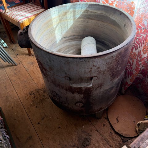 Stor vedeldad gryta i metall med eldstad i botten och sidomonterat rör. Trälocket på toppen följer formen på grytan och det finns handtag på sidorna för att flytta den.