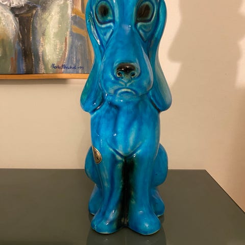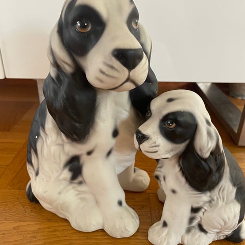 Stor keramikdalmatiner att ha som prydnad inne. Sitter ner med svansen runt kroppen och har svartprickig vit kropp och mörka öron.