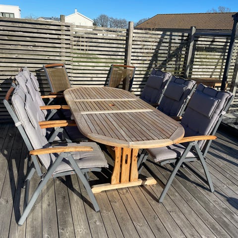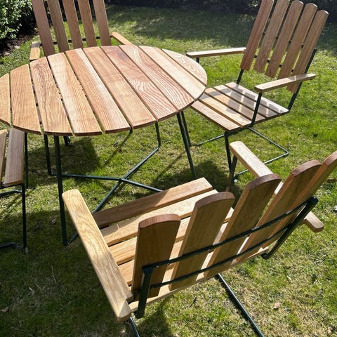 Fyra stapelbara stolar och bordet, 1m i diameter, går att fälla ihop. Underhållsfritt (teak) och i skick som nytt.