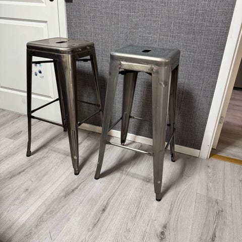 Säljer två stilrena barstolar i vitlackerad metall. Perfekta till köksö, bar eller som extra sittplatser!