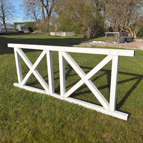 Gammal och Omålad trägrind/staket med kryss och spjälor, passar bra som avskärmning eller infart. Två sektioner som ger ett enhetligt utseende mot tomt eller altan.